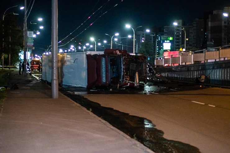 Отмечается, что грузовик ехал со стороны Одесского направления по Окружной. Около 2:00 в районе Одесской площади, заезжая на мост транспортной развязки, его резко начало заносить вправо. На своем пути многотонная фура снесла отбойник и вылетела с моста, упав на правый бок. К месту аварии сразу направились патрульные, чтобы помочь водителю. Он остался жив.