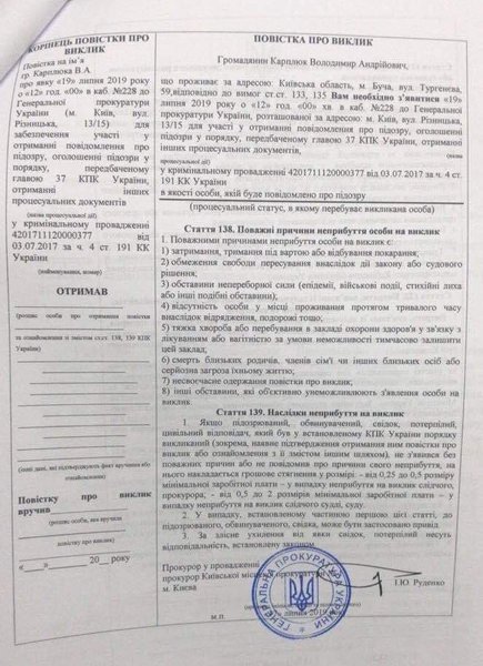 Уголовное производство в отношении Карпюка расследуется по ч. 4 ст. 191 (присвоение, растрата имущества или завладение им путем злоупотребления служебным положением, причем речь идет об особо крупных размерах) Уголовного кодекса Украины.