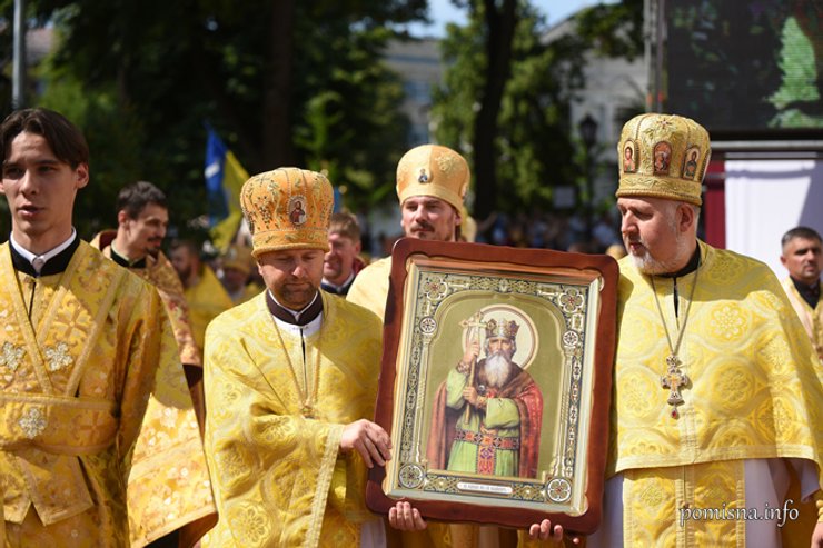 Затем паломники вышли с Крестным ходом от храма Софии Киевской до памятника князю Владимиру. Их маршрут проходил через Софийский Собор, Владимирский проезд, улицу Трехсвятительскую, парк Владимирская горка. В завершении шествия будет проведен молебен у памятника Владимиру Крестителю.