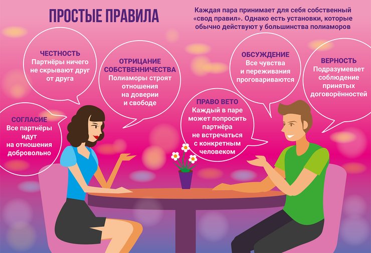В полиамории существуют скорее не правила, а некие договоренности, и они обычно гибкие. Знаю пару, которая решила, что нельзя заниматься оральным сексом с другими партнерами. У нас главное правило — делай то, что ты хочешь, но все участники отношений должны знать друг о друге.