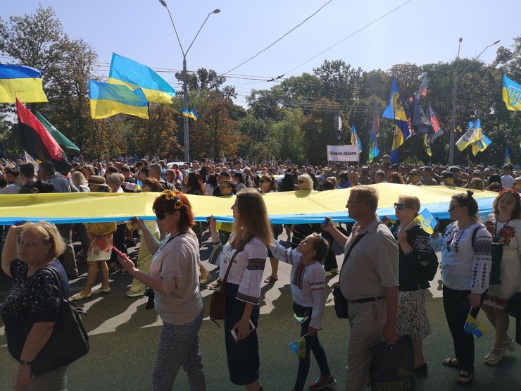 В Киеве начался Марш защитников Украины, в котором принимают участие союзы ветеранов, волонтеры, семьи погибших воинов, духовенство, а также все желающие.