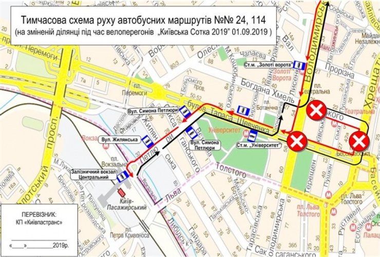 Автобусы №114 будут отъезжать от ул. Милославской до ул. Владимирской по действующему маршруту, далее ул. Владимирская - б-р Тараса Шевченко - ул. Симона Петлюры - вокзал "Центральный" - ул. Симона Петлюры - б-р Тараса Шевченко - ул. Леонтовича - ул. Богдана Хмельницкого - ул. Владимирская - Владимирский проезд - ул. Михайловская - ул. Крещатик, дальше по действующей трассе.