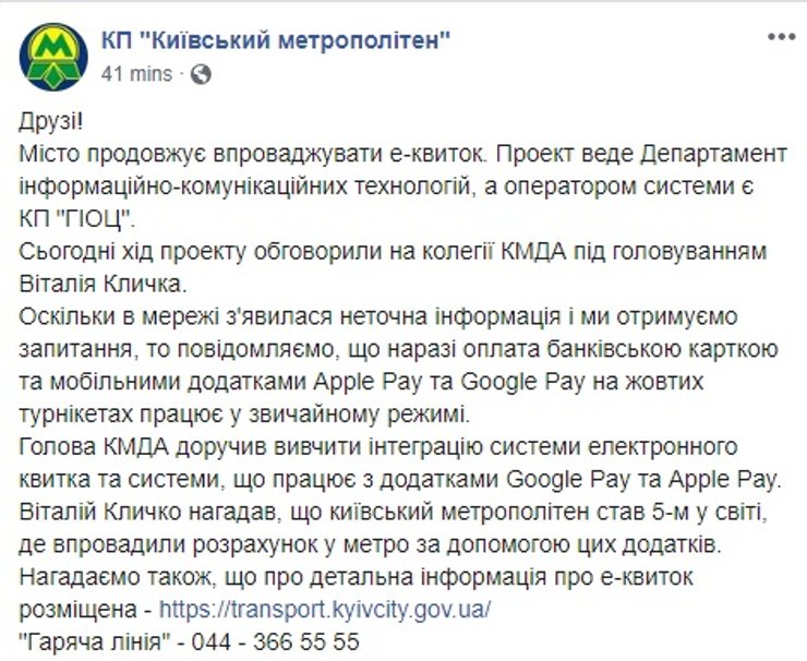 Там только указано, что Кличко поручил изучить вопрос совместимости системы электронного билета и системы, работающей с приложениями Google Pay и Apple Pay.