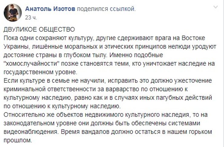 Все же, многие осуждают злоумышленников, и даже вспоминают "Парад членов" в Национальной академии образотворческих искусств и архитектуры от тогда еще студента Спартака Хачанова, который после инцидента и угроз со стороны праворадикалов из С14 выехал в ЕС, в Финляндию. А кто-то и вовсе призывает ужесточить ответственность за "варварство по отношению к культурному наследию" и установить возле достопримечательностей системы видеонаблюдения.