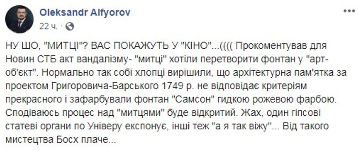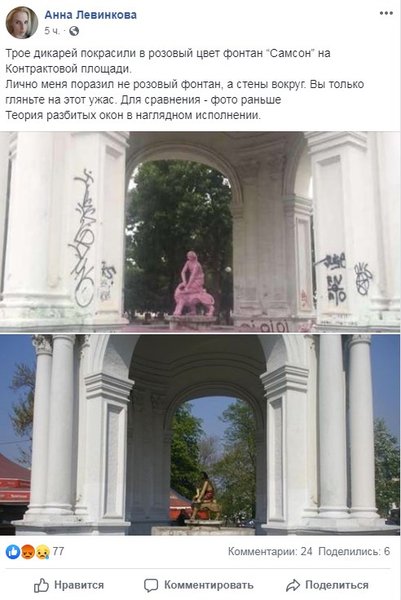 С другой стороны, пользователи уточняют, что установленный на Контрактовой площади фонтан – не исторический артефакт. Настоящего Самсона убрали с Контрактовой в 1934 году, а сейчас на его месте стоит бетонная копия, установленная в 1982 году. Соответственно, краску с него легко удалить.