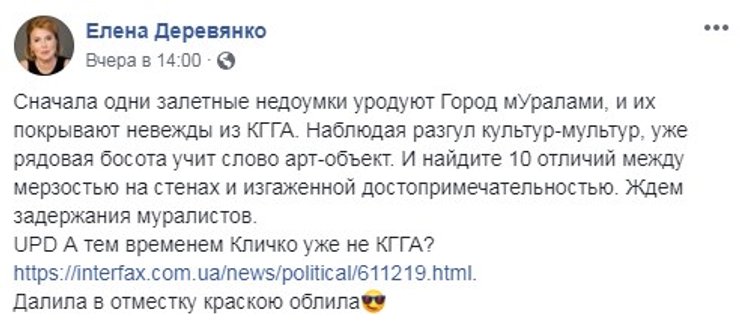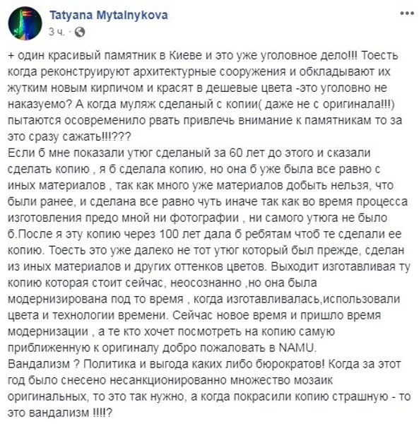 Также у пользователей недоумение вызывает уголовное дело, открытое за покраску копии памятника: "Один красивый памятник в Киеве и это уже уголовное дело! Т.е. когда реконструируют архитектурные сооружения и обкладывают их жутким новым кирпичом и красят в дешевые цвета - это уголовно не наказуемо? А когда муляж сделаный с копии (даже не с оригинала) пытаются осовременить, то за это сразу сажать?".