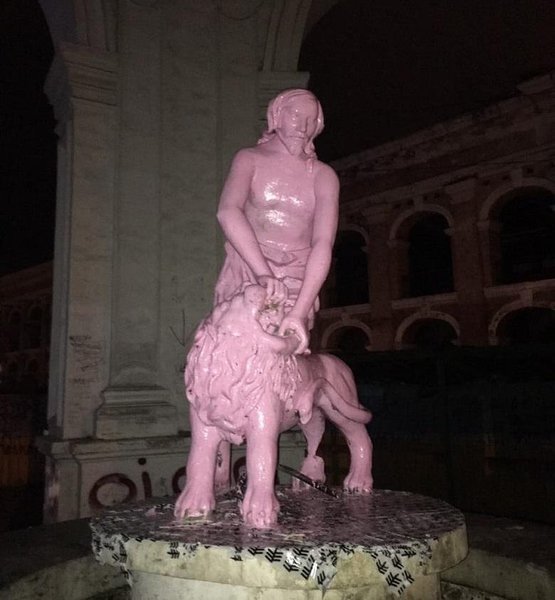 В ночь на 4 сентября неизвестные раскрасили местную киевскую достопримечательность – фонтан "Самсон" – в розовый цвет. Фокус интересовался, что грозит художникам и кто будет заниматься реставрацией фонтана