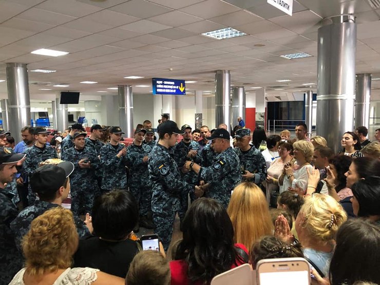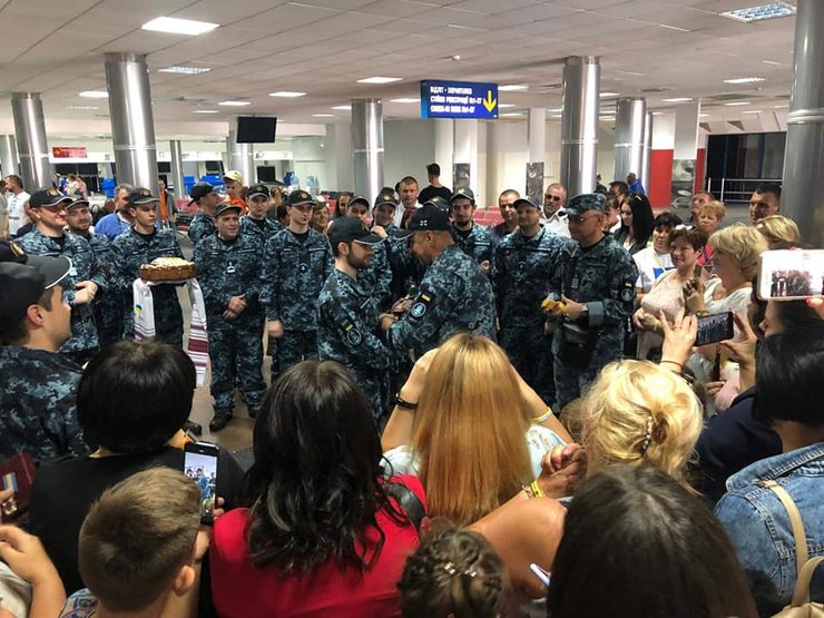 "Сегодня, в аэропорту Борисполь украинских военных моряков из плена встречали традиционным украинским караваем с солью, и наградами. Командующий ВМС ВС Украины адмирал Игорь Воронченко вручил нашим военным награды и очередные воинские звания", – говорится в сообщении.