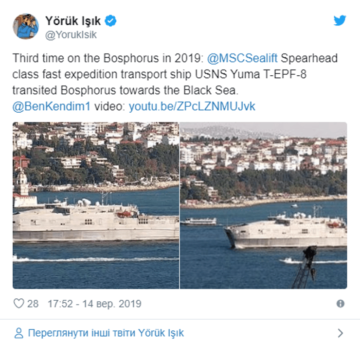 В Черное море через Босфорский пролив идет экспедиционный транспортное судно USNS Yuma (T-EPF-8) ВМС США. Об этом свидетельствуют данные Bosphorus Observer в Twitter.