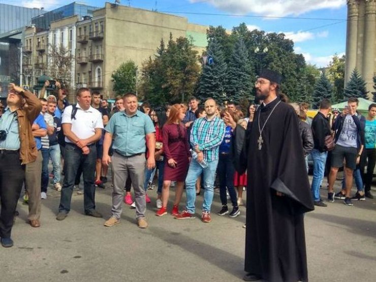 В это же время, на место проведения также прибыли десятки противников Марша равенства. Они держали в руках плакат "За традиционный семейные ценности". Также в толпе противников присутствовал в человек в рясе священнослужителя. Борцы за "семейные ценности" скандировались "Слава Украине – Героям слава".