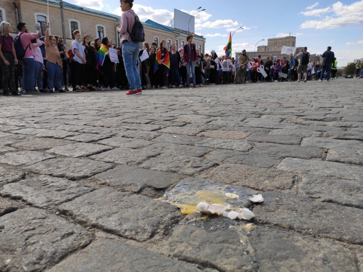 Несмотря на то, что участников марша окружало большое количество сотрудников полиции, без столкновений не обошлось. Так, около 14:00 из-за оцепления правоохранителей оппоненты участников марша забросали яйцами. После этого, полицейский кордон был усилен.