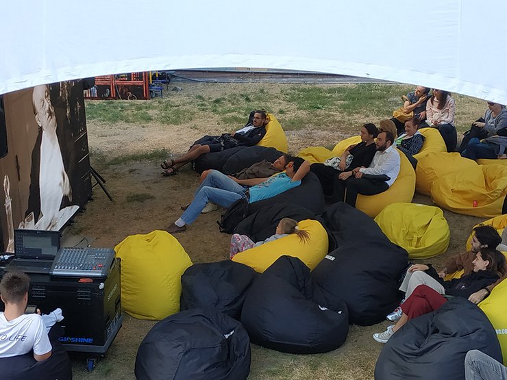 В шатре в сквере Слипака на мягких пуфах расположились те, кому ближе кинотворчество по мотивам Михаила Булгакова – здесь крутили "Собачье сердце", "Ивана Васильевича" и др.