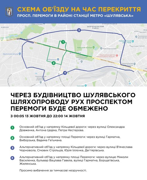 С ночи 13 октября до вечера 14 октября в Киеве будет перекрыто автомобильное движение по проспекту Победы, в связи с началом активной фазы возведения Шулявского путепровода. Власти города просят прощения у водителей и пассажиров общественного транспорта за временные неудобства.