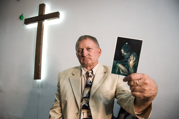 Виталий показывает свое фото, снятое сразу после освобождения из плена. Он не держит зла на мучителей и рад, что в заключении ему удалось склонить четырех человек к вере в Бога