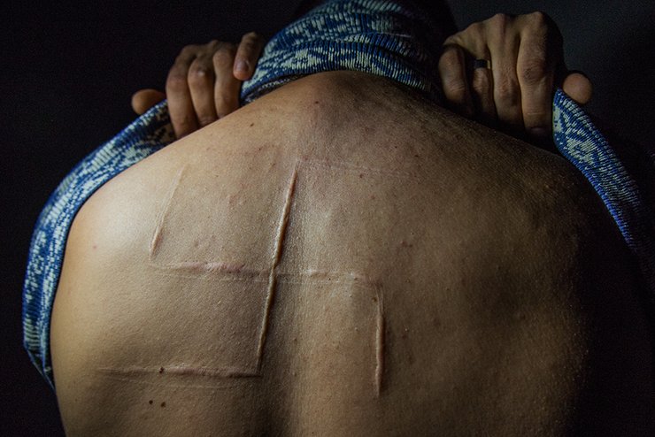 Житель Донецка Богдан демонстрирует свастику, которую ему вырезали на спине во время десятичасового плена 27 мая 2014 года. В тот день вооруженные люди забрали Богдана с работы, порезали ему спину, а затем в его присутствии спорили о том, стоит ли отпускать его живым. Богдану "повезло": по свидетельству других освобожденных из плена, тех, кому наносили видимые увечья, обычно убивали