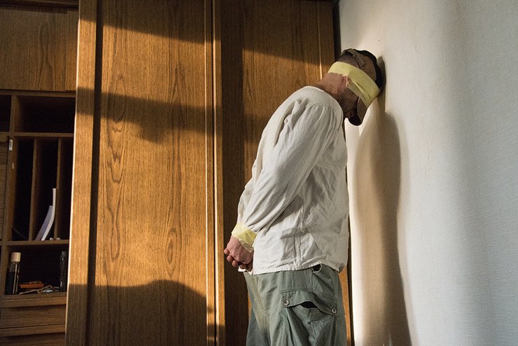 В комфортной атмосфере своего дома Дмитрий демонстрирует, как его связывали, когда он был в заточении. На нем рубаха, которую выдали после задержания. Психологические травмы от пребывания в плену бывают настолько сильными, что, даже освободившись, люди годами живут, как в плену