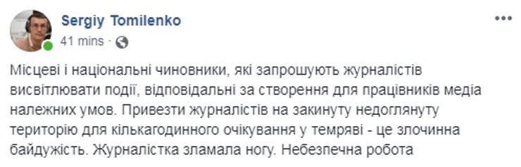Олег Деренюга отметил, что после отъезда ПТС канала "1+1" света в месте ожидания не осталось совсем. В итоге в ров упала журналистка ТРК "Украины" Анжела Слободян и сломала ногу. Рядом находилась скорая, женщине сразу оказали помощь, предварительно, у нее диагностирован открытый перелом.