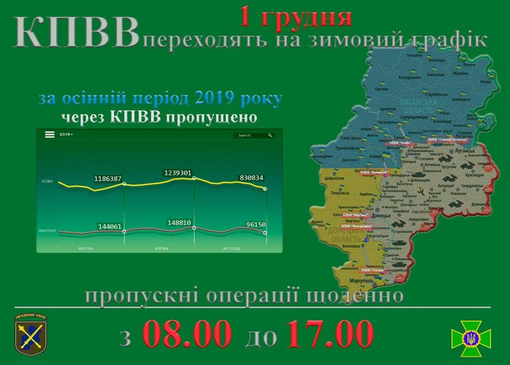 "Все контрольные пункты въезда-выезда на линии разграничения в районе проведения операции Объединенных сил с 1 декабря 2019 переходят на график зимнего периода. Контрольно-проверочные мероприятия и пропуск лиц и транспортных средств через линию разграничения будет осуществляться ежедневно с 08.00 до 17.00. Командование ОС обращается к гражданам с просьбой учесть эту информацию при планировании своих поездок", – сказано в сообщении.