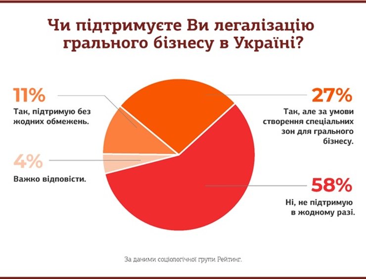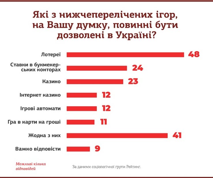 Согласно исследованию, среди всех видов игорного бизнеса наибольшее доверие украинцев вызывают лотереи. Наиболее неприемлемыми опрошенные назвали интернет-казино, игровые автоматы и игру на деньги.