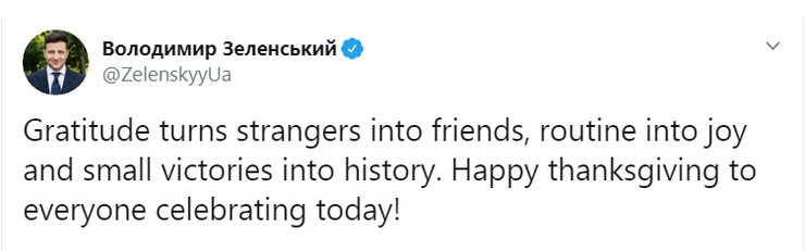 Президент Украины Владимир Зеленский в своем микроблоге Twitter опубликовал поздравление с национальным праздником США Днем благодарения (Thanksgiving Day). Что примечательно, поздравительный текст написан на английском, а перевода на украинский язык нет.