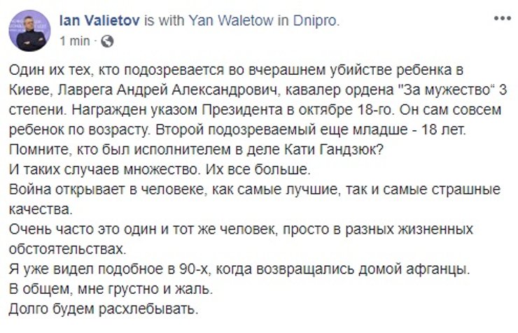 И хоть правоохранители не раскрывают имена подозреваемых, они уже стали известны. Это Андрей Лаврега и Евгений Семенов. Они оба служили на Донбассе в составе добровольческих подразделений, при этом в зону АТО они отправились еще будучи несовршеннолетними. Лаврега несколько раз был ранен и получил от пятого президента Петра Порошенко орден "За мужество" ІІІ степени.