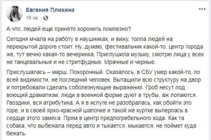 4 декабря Плихина рассказала в Facebook, как по дороге на работу попала в похоронную процессию. Она узнала, что хоронят сотрудника СБУ, однако не знала, что это погибший на Донбассе боец.