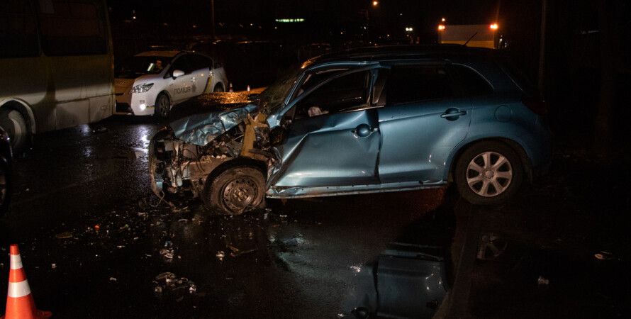 В Днепровском районе Киева произошло ДТП. Автомобиль Mitsubishi ASX под управлением нетрезвой 67-летней женщины врезался в Toyota, Renault и протаранил автобус Богдан.