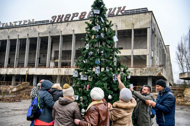 В Припяти впервые с момента аварии на Чернобыльской АЭС установили новогоднюю елку возле одного из центральных зданий города – дворца культуры "Энергетик".Украшали елку бывшие жители Припяти, и причем не только новогодними игрушками, но и своими детскими фотографиями.