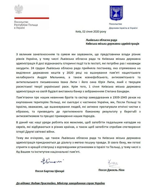 Посол Израиля в Украине Джоель Лион и посол Польши в Украине Бартош Цихоцкий обнародовали на странице посольства Республики Польша в Facebook совместное заявление, в котором осудили КГГА и Львовский облсовет за мероприятия в честь бывшего главы ОУН Степана Бандеры и полковника армии Украинской Народной Республики Андрея Мельника.