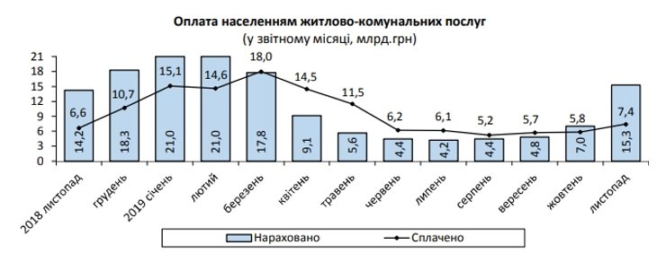 Задолженность населения по оплате жилищно-коммунальные услуги на конец ноября 2019 года составила 60 млрд грн, что на 8 млрд грн больше, чем месяцем ранее.