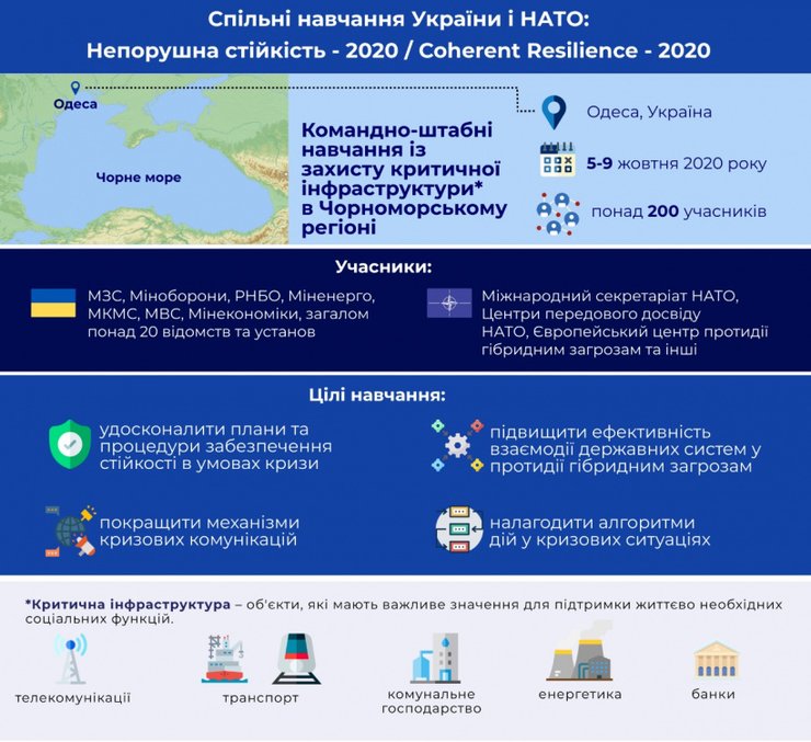 "Учения Нерушимая устойчивость-2020 состоятся 5-9 октября этого года в Одессе. Участники из Украины и стран НАТО будут отрабатывать алгоритмы действий в кризисных ситуациях, которые могут возникнуть в Черноморском регионе. Цель – слаженно, своевременно и грамотно реагировать на кибератаки, нападения на порты, захват транспортных путей и другие угрозы", – сказано в сообщении.