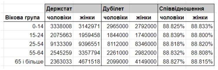После этого обобщенные по возрастным группам данные сопоставили с показателями презентации Дубилета. Исследователей "поразило практическое одинаковое соотношение между группами по полу и возрасту – что составляет около 88,8%" (данные Дубилета от данных Госкомстата).