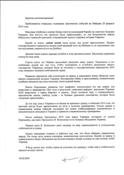 "После выборов Президента 2019 года народ Украины отстранил от власти Порошенко, дав шанс президенту В. Зеленскому и его команде объединить Украину. Первые шаги Зеленского дают надежду на мир, справедливость и установление стабильности в стране. Нужно ежедневно помнить и работать над тем, что было обещано украинскому народу. На этом пути нужны союзники, компетентные исполнители… Я буду делать все, чтобы страна не упустила эту надежду, чтобы мир и стабильность пришли на нашу землю", – говорится в тексте обращения.