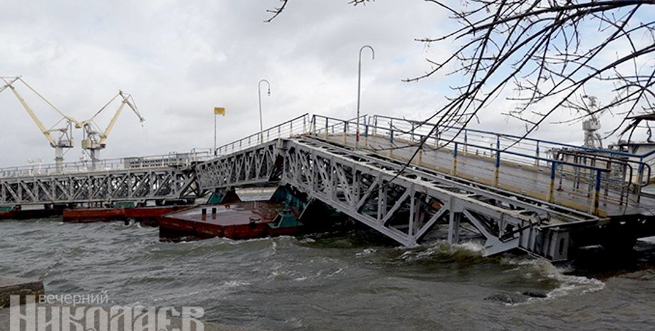 Как уточняет сайт 0512.com.ua, мост рухнул из-за шквального ветра. Металлическая конструкция отделилась от бетонной части со стороны Набережной и упала в воду.