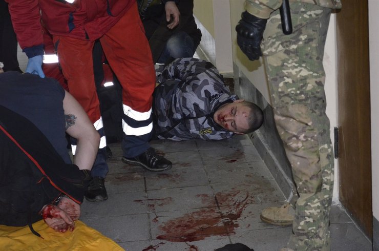 Молодые люди пытались штурмом взять здание городского совета. Злоумышленники повредили входную дверь, окна и мебель горсовета. Помимо этого, "дружинники" бросали камни, дымовые шашки и петарды.