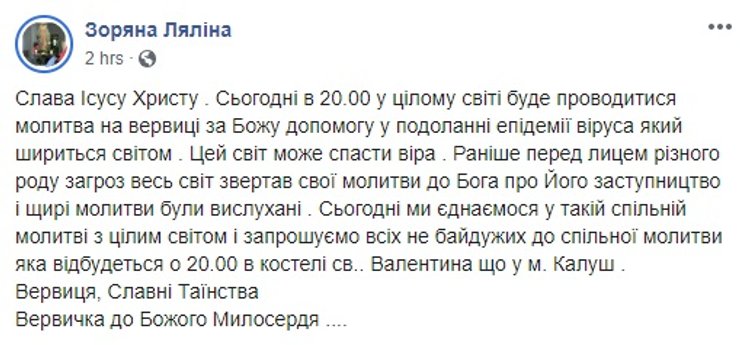 Несмотря на все рекомендации МОЗ, украинцы посчитали, что помощь высших сил не помешает, и, вопреки рекомендации не собираться большими группами, кое-где призывают сходить на службы в церковь. Помолиться. Крестный ход против коронавируса тоже уже был. Его организовал в Виннице Московский патриархат и, как заявили организаторы, является "традиционной реакцией церкви на вспышки болезней, засухи, природные катаклизмы и эпидемии".