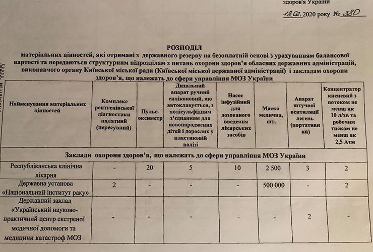 Также Шмыгаль обнародовал таблицу, в которой показано, сколько аппаратов и масок получат ключевые медицинские учреждения и каждая из областей (отметим, что в опубликованном документе отсутствуют четыре области - Ивано-Франкоская, Львовская, Николаевская, Одесская и Полтавская).