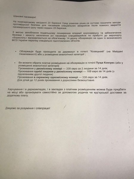 Он заявил, что чартер туристы оплатили самостоятельно, а при покупке билетов никто не рассказал о том, что они будут на обсервации, а теперь от них требуют согласие на обсервацию (бесплатную в гостнице "Козацкий" или платую в Пуще-Водице). Без предоставления такого согласия пассажиров не выпускают из самолета.