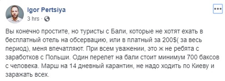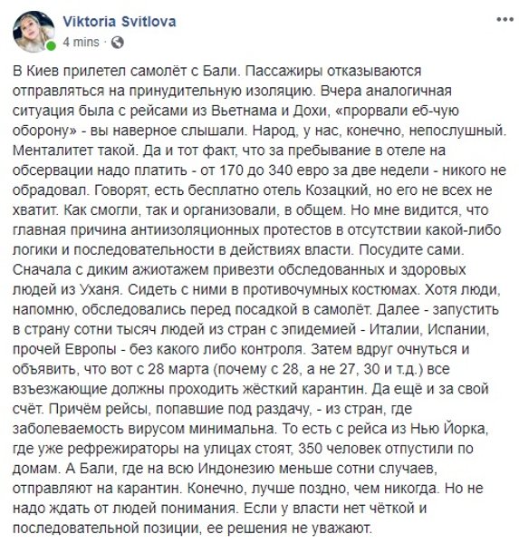Пока Кабмин принимал постановления, обязывающие украинских граждан, возвращающихся из-за границы, отправляться на принудительную обсервацию, в Борисполь летели украинские туристы из Вьетнама и с острова Бали. Ступив на родную землю, они оказали властям яростное сопротивление и спровоцировали в соцсетях не менее бурное обсуждение запоздалых мер правительства и наших национальных особенностей