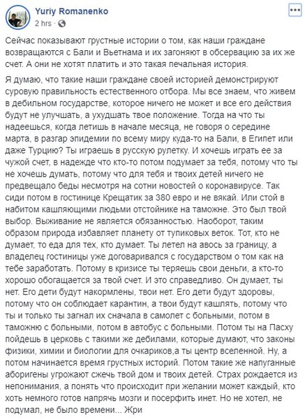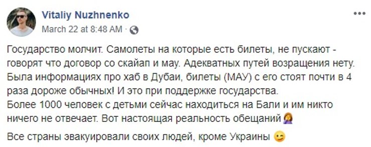 Впрочем, переложить хотя бы часть ответственности на неправильный народ все-таки получилось. Тем более, что в соцсетях довольно быстро стали задаваться вопросом, а зачем, собственно, украинцам понадобилось в условиях пандемии лететь на Бали? И почему они не пытались вернуться раньше, когда стало ясно, что с этим могут возникнуть проблемы. На что некоторые пассажиры ответили, что улетели еще зимой, их обратные билеты пропали, а новые стоили слишком дорого.