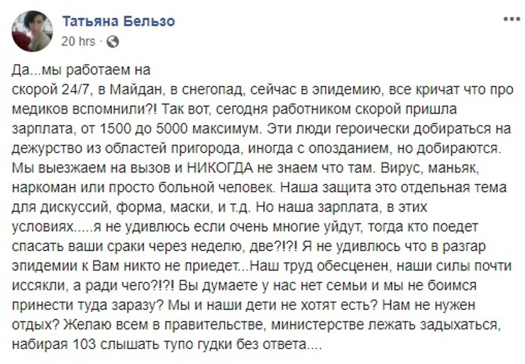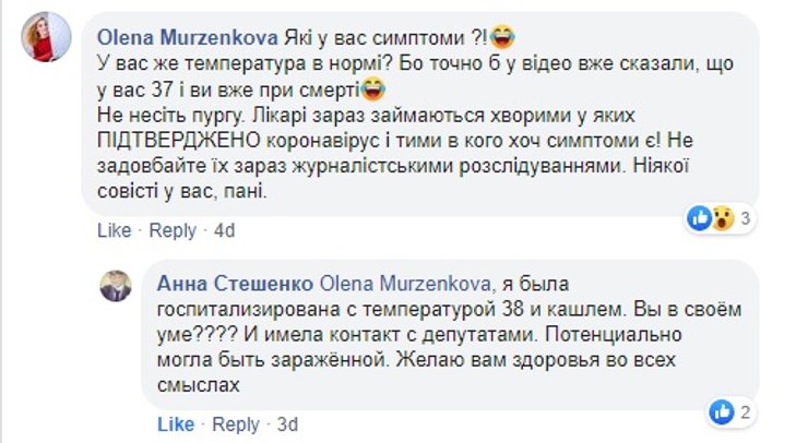 Но журналистка, по крайней мере, попала в больницу. Нардепу от "Слуги народа" Анне Скороход так и не удалось это сделать. 28 марта нардеп написала, что несколько дней назад у нее поднялась температура, появилась ломота в теле и головная боль – частые признаки заболевания коронавирусом. Женщина решила провериться и поехала в поликлинику, где врачи безо всяких тестов определили, что у нее НЕ коронавирус. На просьбу сделать тест ответили отказом, потому что тесты делают только если "100% симптомы". На следующий день нардепу стало хуже и она снова предприняла попытку сделать тест на COVID-19. В лабораториях ей посоветовали вызвать скорую, которая не приехала, обратиться к семейному врачу, контакта которого у нардепа не было и только когда она воспользовалась "корочкой депутата", то ей предложили отправиться в инфекционную больницу в Белую Церковь, куда уже несколько недель назад попадал музыкант Валерий Харчишин. Тогда, признается Скороход, она снова применила свое депутатский статус и все-таки сдала тесты в Александровской больнице. Но ее предупредили, экспресс-тест неточен и результат показывает на 5-10 день симптоматики. ПЦР-тест не сделали, потому что "решение о его проведении принимается каждое утро на совещании докторов". Но Скороход все же сдала его, просто вызвав скорую частной клиники "Добробут". По словам нардепа, сам тест бесплатный, но пациент оплачивает вызов и защитные костюмы парамедиков. "Чтоб сдать тест, мне понадобилось: 2 дня, корочка нардепа (а как быть тем, кто ее не имеет? кстати, до сих пор стыдно за пользование) и 4100 грн за вызов "Добробута", а что делать тем, у кого их нет?", — резюмировала Скороход.