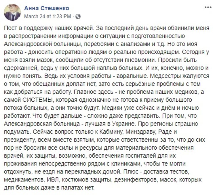 Огласке придаются случаи, когда тестируются люди, имеющие ресурсы и желание поделиться своими мытарствами с окружающими. Так, достаточно подробно описала свое пребывание в Александровской больнице журналистка издания "Левый берег" Анна Стешенко. Она была госпитализирована 23 марта с температурой и кашлем, имела контакт с потенциально зараженными. Из плюсов – ее поместили в отдельный бокс, провели рентген, но лекарства все равно пришлось покупать за свои кровные. Также для новоприбывших больных с подозрением на COVID-19 не хватает мест. После того, как был получен отрицательный результат теста – журналистку отпустили домой.