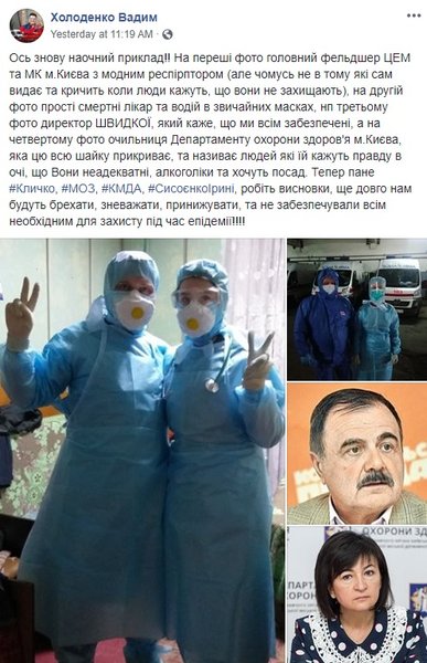 Не обеспечен всем необходимым даже Киев. И если в центральной Александровской больнице, по словам главврача, все достаточно оптимистично, хотя пациенты пишут обратное, то на станциях скорых врачи вынуждены собирать защитные костюмы буквально с миру по нитке.