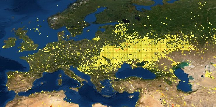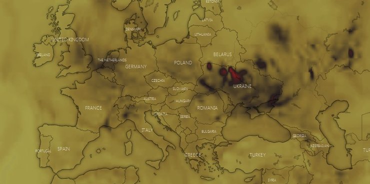 Как показывают данные портала по Windy.com над Украиной наблюдается повышенная концентрация угарного газа по сравнению с другими регионами Европы.