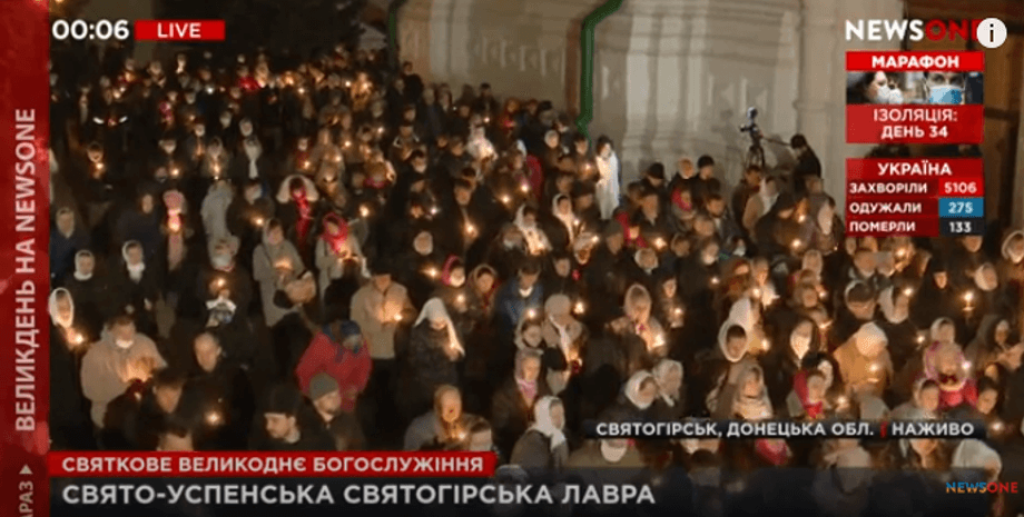 В Донецкой области в Свято-Успенской Святогорской Лавре Московского патриархата на Пасхальное богослужение в ночь с 18 на 19 апреля пришли верующие, большинство из которых не имели средств защиты от коронавируса и не соблюдали дистанцию.