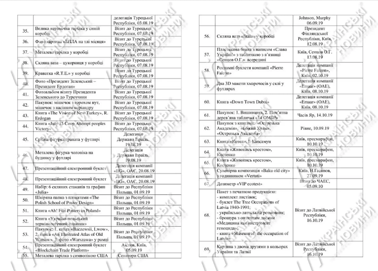 В течение первого полугодия своего президентства Зеленский получил в подарок галстук Hermes от Дональда Туска, от бизнесменов Китая – красную вазу с рисунком цветов, свиток с драконом и птицей и свиток с изображением моста, от посланника премьер-министра Японии – скатерть, от американских сенаторов – металлическую тарелку с символикой США, от президента Финляндии – вазу, от МИД Польши – запонки, а Швеции – дизайнерскую тарелку из металла. От делегаций Словакии, Израиля и Франции – тарелку из хрусталя, статуэтку и ручку.