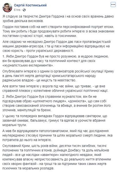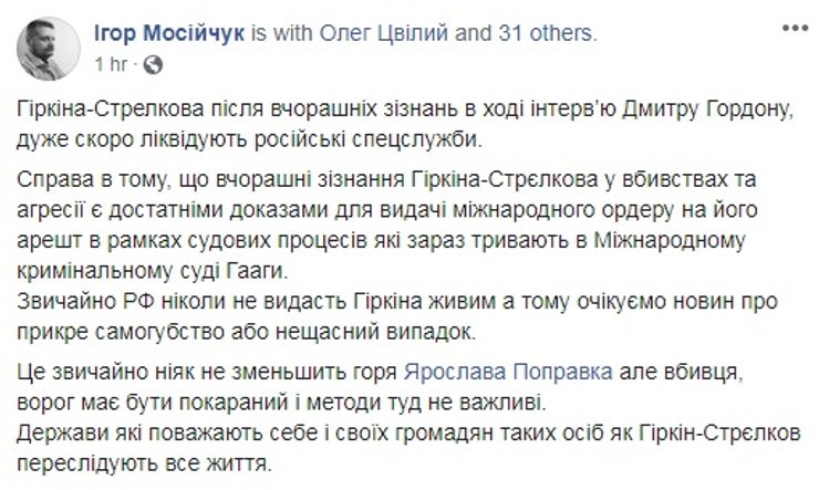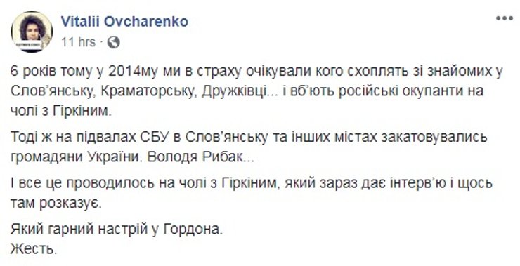 "Я хочу, чтобы люди во всем мире посмотрели это интервью и увидели, как путинская Россия, поставив перед собой цель захватить часть Украины, пришла к нам с огнем и мечом. Игорь Гиркин – безусловно, историческая фигура, и его ответы на мои вопросы – это не просто свидетельские показания, это история. Это интервью – приговор Путину и российской властной верхушке, которые совершили агрессию против моей страны", – сказал Гордон.