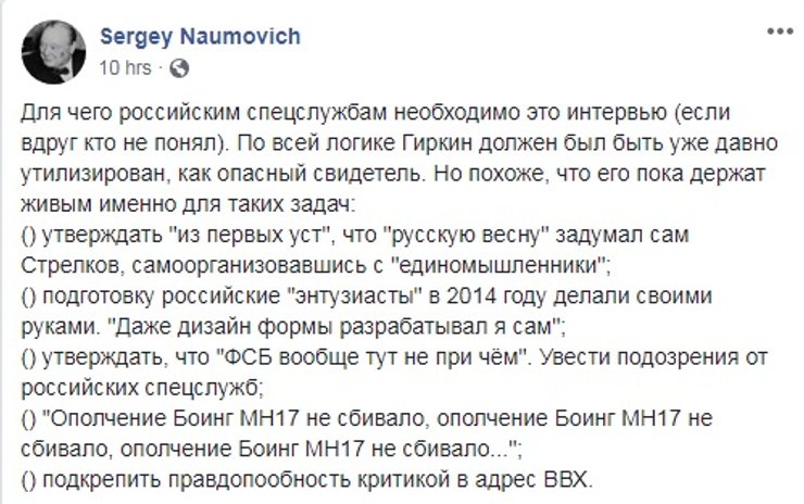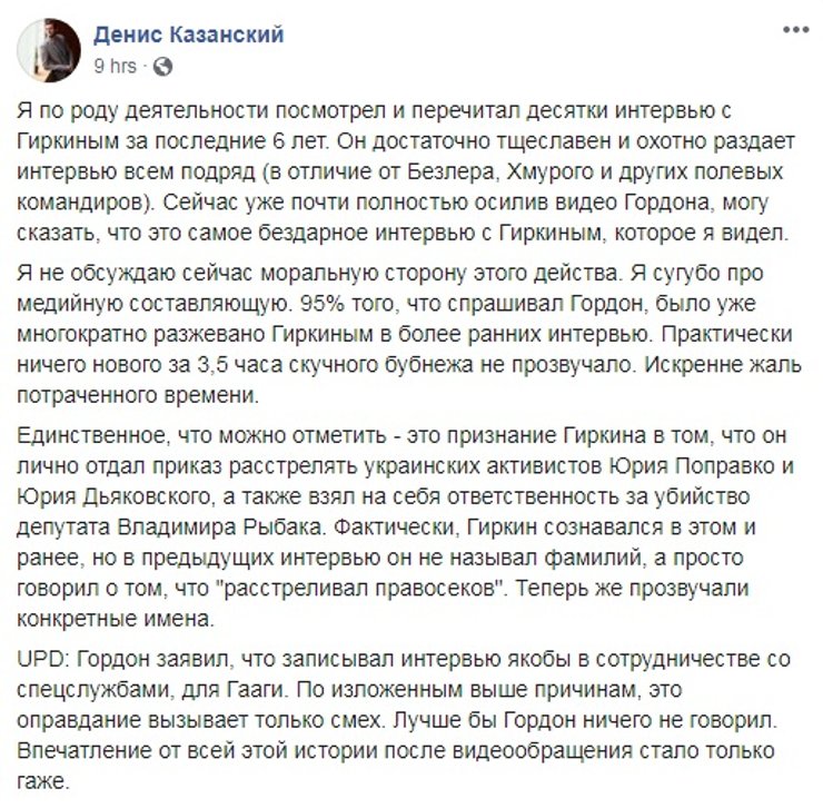 Сам Дмитрий Гордон пояснил, что решил взять интервью у Гиркина, поскольку считает его символом и одним из главных действующих лиц российской агрессии на Донбассе.