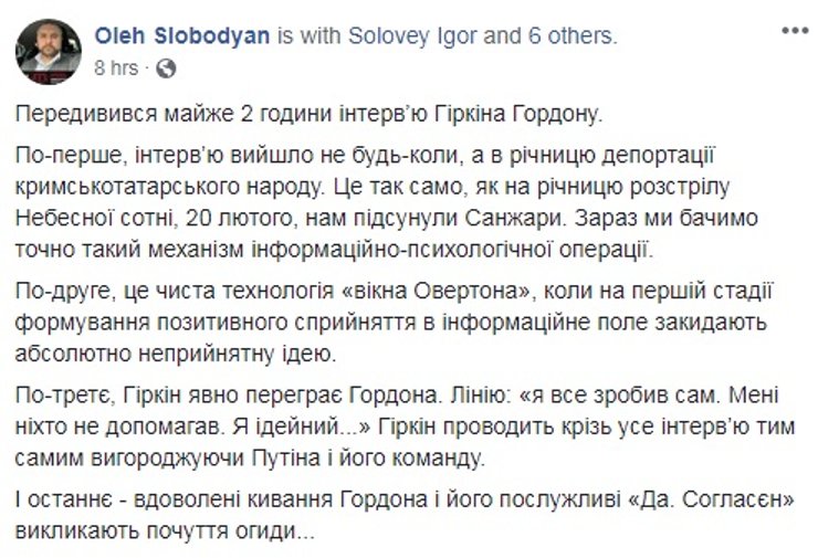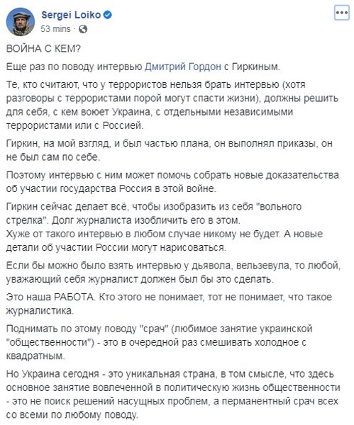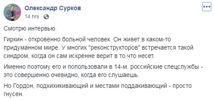 Интервью Гордона с серийным военным преступником Гиркиными (Стрелковым), активно участвовавшим в раздувании военного конфликта на востоке Украины, ожидаемо вызвало сильный резонанс. В соцсетях пытаются выяснить, какие цели преследовал украинский журналист, общаясь с кадровым сотрудником ФСБ, и зачем последнему понадобилось в очередной раз доказывать свою оппозиционность Путину и выставлять себя унылым неудачником, единолично виновным в начале кровавого конфликта