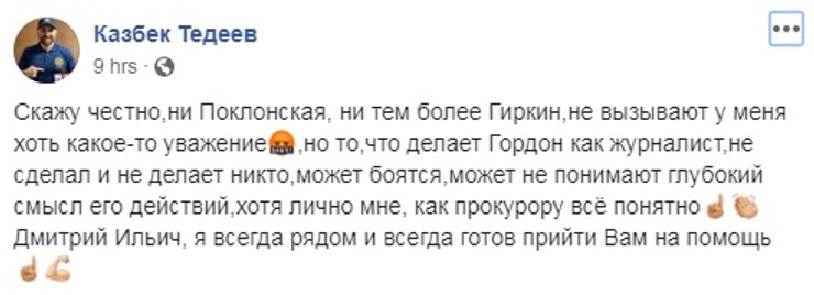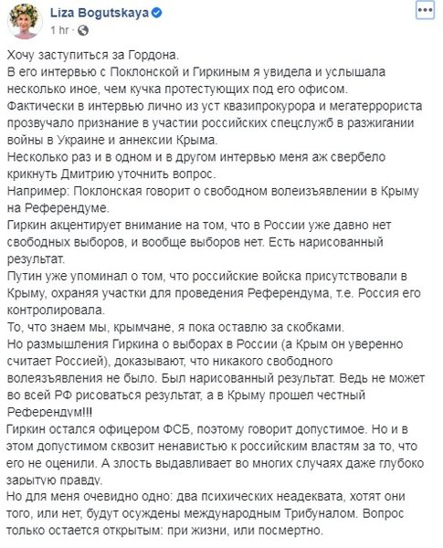 Позже Дмитрий Гордон записал видеообращение в котором заявил, что тем, кто "писал, что я разгоняю "зраду"; всем, кто призывал меня убить, распять и сжечь, будет стыдно". А интервью с Поклонской и Гиркиным были сделаны не просто так, а "в содружестве с украинскими спецслужбами".